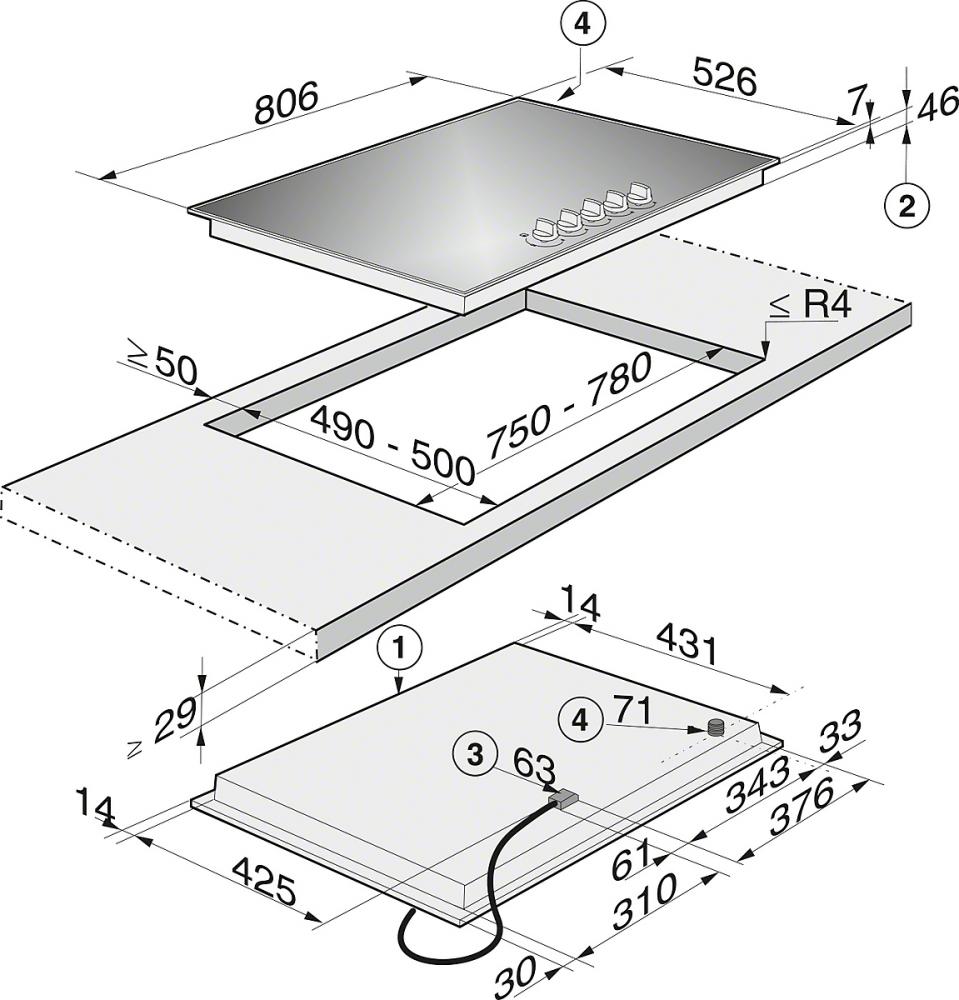 Отверстие в нише выполняют, исходя из размеров самой варочной панели — они должны соответствовать друг другу либо немного превышать размеры выреза. При выборе наиболее распространенной варочной панели с 4 конфорками в столешнице вырезается отверстие шириной 59 см и глубиной около 49-50 см. Толщина столешницы должна быть немного меньше, чем высота варочной панели, в противном случае панель придется заглубить, чтобы она не слишком выступала.