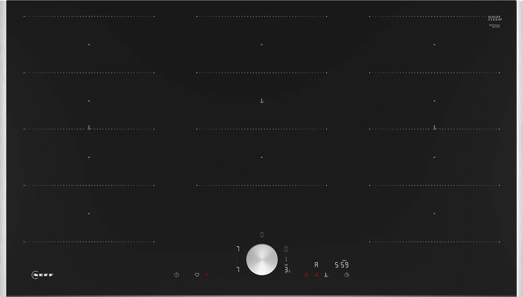 Благодаря функции QuickStart место на поверхности, где установлена посуда, определяется автоматически. Пользователю не нужно выбирать конфорку нажатием соответствующей кнопки: чтобы начать приготовление, ему достаточно только поставить кастрюлю или сковороду на поверхность и выбрать температуру — варочная панель при этом начнет нагревать соответствующую конфорку самостоятельно. При этом требуется использовать посуду исключительно из намагничивающихся материалов — таких, как нержавеющая или эмалированная сталь.