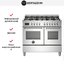 Устройства с тремя духовками также имеют один основной и две дополнительных шкафа разного объема: например, плиты Bertazzoni оснащены большой духовкой объемом 69 литров, средней объемом 54 литра и малой объемом 24 литра. Духовки располагаются в два ряда: две меньшие духовки в одном ряду, большая и ящик для посуды в другом.