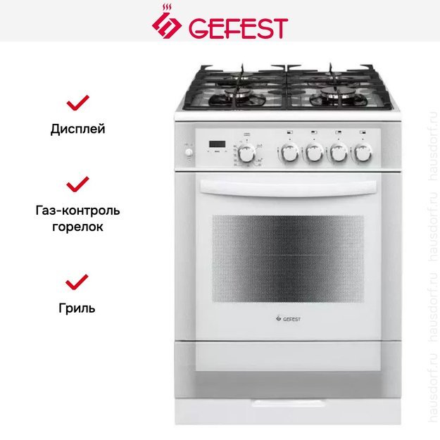 Газовая плита Gefest 6500-03 0042 — отличный выбор как для квартиры, так и для частного дома. Цвет корпуса белый, он гармонично сочетается с мебелью и техникой похожих оттенков, а также может интересно выглядеть на контрасте с ними. Для управления используется удобная и понятная электронная система. Благодаря ей выбирать режимы приготовления и настраивать параметры температуры очень просто. Основная информация о процессе отображается на дисплее. Переключатели не только выполняют техническую функцию, но и поддерживают общий дизайн; тип элементов: сенсорные + поворотные.