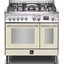 Устройства с тремя духовками также имеют один основной и две дополнительных шкафа разного объема: например, плиты Bertazzoni оснащены большой духовкой объемом 69 литров, средней объемом 54 литра и малой объемом 24 литра. Духовки располагаются в два ряда: две меньшие духовки в одном ряду, большая и ящик для посуды в другом.