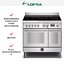 Устройства с тремя духовками также имеют один основной и две дополнительных шкафа разного объема: например, плиты Bertazzoni оснащены большой духовкой объемом 69 литров, средней объемом 54 литра и малой объемом 24 литра. Духовки располагаются в два ряда: две меньшие духовки в одном ряду, большая и ящик для посуды в другом.