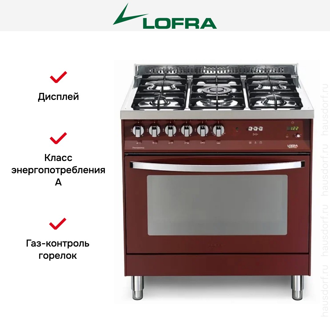 Комбинированная плита Lofra PRG86GVT/C — отличный выбор как для квартиры, так и для частного дома. Цвет корпуса бордо, он гармонично сочетается с мебелью и техникой похожих оттенков, а также может интересно выглядеть на контрасте с ними. Для управления используется удобная и понятная механическая система. Благодаря ей выбирать режимы приготовления и настраивать параметры температуры очень просто. Основная информация о процессе отображается на дисплее. Переключатели не только выполняют техническую функцию, но и поддерживают общий дизайн; тип элементов: поворотные + кнопки.