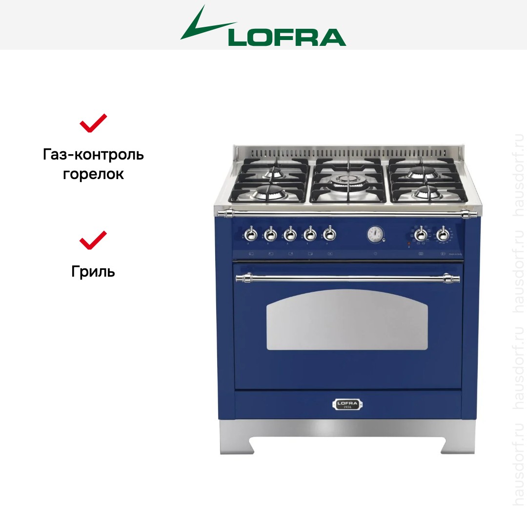 Комбинированная плита Lofra RBLG96MFT/Ci Chrome — отличный выбор как для квартиры, так и для частного дома. Цвет корпуса синий, он гармонично сочетается с мебелью и техникой похожих оттенков, а также может интересно выглядеть на контрасте с ними. Для управления используется удобная и понятная механическая система. Благодаря ей выбирать режимы приготовления и настраивать параметры температуры очень просто. Переключатели не только выполняют техническую функцию, но и поддерживают общий дизайн; тип элементов: поворотные.