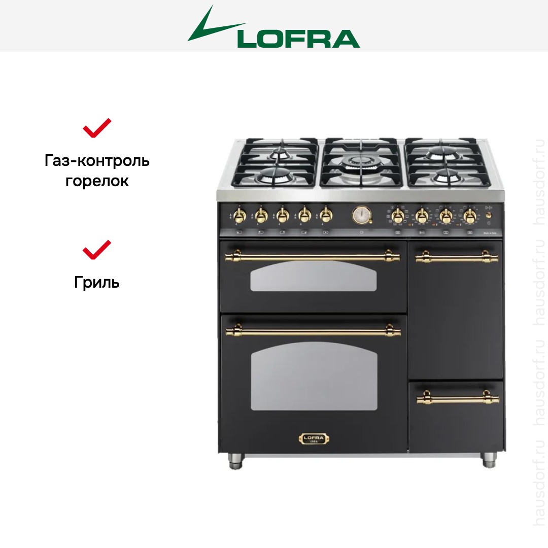 Комбинированная плита Lofra RNMT96MF2ET/CIF Brass — отличный выбор как для квартиры, так и для частного дома. Цвет корпуса черный, он гармонично сочетается с мебелью и техникой похожих оттенков, а также может интересно выглядеть на контрасте с ними. Для управления используется удобная и понятная механическая система. Благодаря ей выбирать режимы приготовления и настраивать параметры температуры очень просто. Переключатели не только выполняют техническую функцию, но и поддерживают общий дизайн; тип элементов: поворотные.