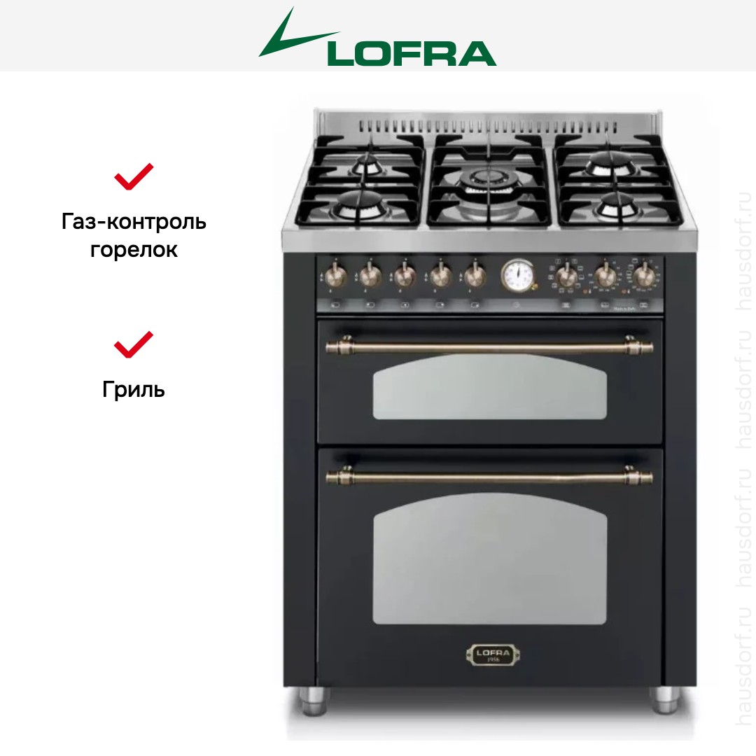 Комбинированная плита Lofra RNMUD76MFTE/CI Brass — отличный выбор как для квартиры, так и для частного дома. Цвет корпуса черный, он гармонично сочетается с мебелью и техникой похожих оттенков, а также может интересно выглядеть на контрасте с ними. Для управления используется удобная и понятная механическая система. Благодаря ей выбирать режимы приготовления и настраивать параметры температуры очень просто. Переключатели не только выполняют техническую функцию, но и поддерживают общий дизайн; тип элементов: поворотные.