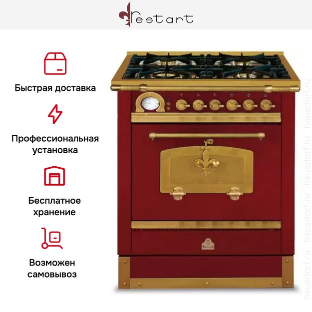 Гораздо разнообразнее представлена фурнитура в моделях в классическом, средиземноморском, деревенском или ретро-дизайне. Так, модели производства Lofra оснащаются фигурными рейлингами и поворотными переключателями цвета латуни, состаренного серебра, хрома, золота. В варочных центрах La Cornue интерес представляет круглая накладная ручка дверцы духовки серебристого цвета. Фурнитурой в стиле ретро оснащаются варочные центры производства Smeg, Kaiser, Bertazzoni, но особенно разнообразны и оригинальны модели производства итальянской компании Restart с фурнитурой из меди и латуни. Каждая такая модель изготавливается по индивидуальному проекту, и покупатель может выбрать цвет и форму переключателей, дверцы и ручек духовых шкафов и другие элементы дизайна.