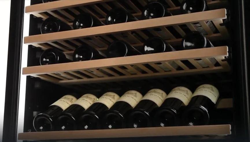 Полки в винных шкафах позволяют размещать бутылки для хранения в горизонтальном положении. Это необходимо, чтобы пробка постоянно смачивалась жидкостью и не пересыхала. Плотно закрытая пробка гарантирует, что внутрь бутылки не проникнет наружный воздух. Кислород, содержащийся в воздухе, может стать причиной ухудшения вкуса вина и даже его скисания. Кроме того, горизонтальное положение позволяет лучше оценить количество осадка. Материал изготовления полок выбирается, исходя из требований, предъявляемых к содержанию коллекции вин. Одним из основных требования является отсутствие или максимальное сокращение вибрации и хорошая фиксация бутылок на месте хранения. Даже если полка выдвигается, бутылки должны оставаться на своем месте. Второе требование исключает применение стеклянных полок, как в обычном холодильнике: на них почти невозможно зафиксировать бутылки.