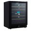 Стеклянная дверь — дополнительный изящный штрих к общему дизайну модели. Специальное покрытие защищает вино от влияния ультрафиолетовых лучей, которые проникают, если шкаф находится в солнечной комнате. Цвет корпуса — черный. Дверь можно перевесить на другую сторону, поэтому вариантов размещения его в доме становится больше.