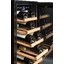 Полки в винных шкафах позволяют размещать бутылки для хранения в горизонтальном положении. Это необходимо, чтобы пробка постоянно смачивалась жидкостью и не пересыхала. Плотно закрытая пробка гарантирует, что внутрь бутылки не проникнет наружный воздух. Кислород, содержащийся в воздухе, может стать причиной ухудшения вкуса вина и даже его скисания. Кроме того, горизонтальное положение позволяет лучше оценить количество осадка. Материал изготовления полок выбирается, исходя из требований, предъявляемых к содержанию коллекции вин. Одним из основных требования является отсутствие или максимальное сокращение вибрации и хорошая фиксация бутылок на месте хранения. Даже если полка выдвигается, бутылки должны оставаться на своем месте. Второе требование исключает применение стеклянных полок, как в обычном холодильнике: на них почти невозможно зафиксировать бутылки.