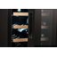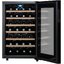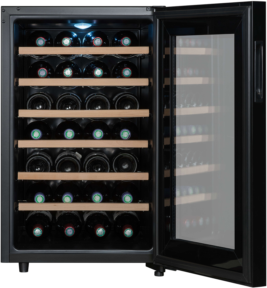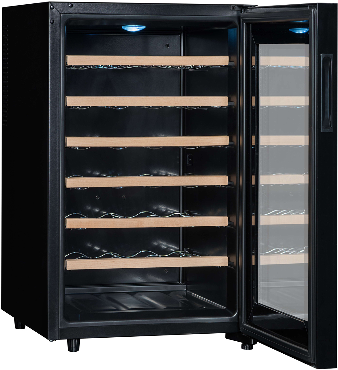 Стеклянная дверь — дополнительный изящный штрих к общему дизайну модели. Специальное покрытие защищает вино от влияния ультрафиолетовых лучей, которые проникают, если шкаф находится в солнечной комнате. Цвет корпуса — черный.