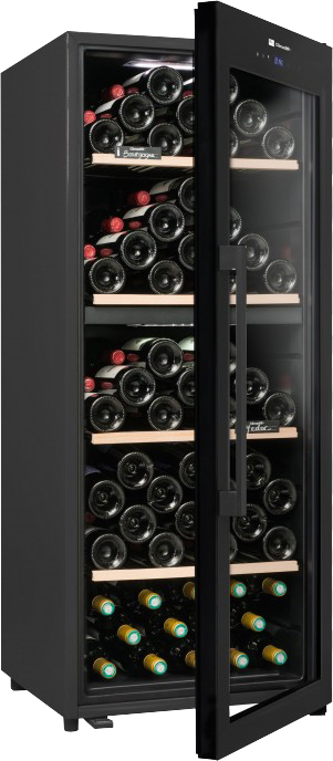 Стеклянная дверь — дополнительный изящный штрих к общему дизайну модели. Специальное покрытие защищает вино от влияния ультрафиолетовых лучей, которые проникают, если шкаф находится в солнечной комнате. Цвет корпуса — черный.