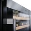 Встраиваемые холодильники для вина оснащаются специальной системой вентиляции: охлаждающая система у них находится в нижней части корпуса спереди. На такие устройства не навешивается мебельный фасад: дверца с затемненным стеклом остается на виду и открывается на достаточно широкий угол для свободного выдвижения деревянных полок.
