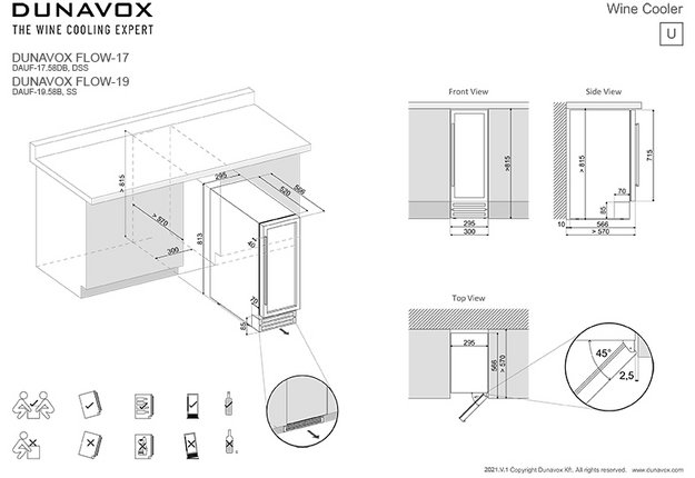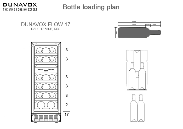 Винный холодильник Dunavox DAUF-17.58DC имеет две температурные зоны, в которых одновременно можно хранить разные сорта алкоголя и выставлять разные сочетания настроек. Он встраивается в нишу, что удобно, если у вас ограничен метраж помещения. Благодаря компактным размерам данная модель — отличный выбор для офиса, гостиничного номера. Количество бутылок, которое можно разместить с учетом полной комплектации и из расчета объема бутылки 0,75 л, — 17 шт.