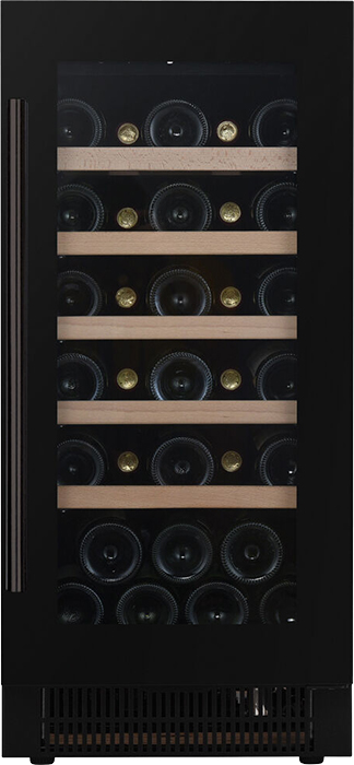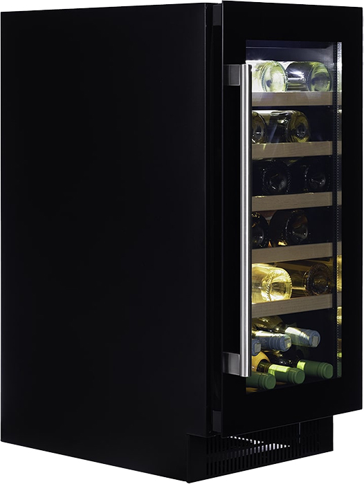 Стеклянная дверь — дополнительный изящный штрих к общему дизайну модели. Специальное покрытие защищает вино от влияния ультрафиолетовых лучей, которые проникают, если шкаф находится в солнечной комнате. Хранение становится еще безопаснее и герметичнее благодаря нескольким слоям стекол. Цвет корпуса — черный матовый. Дверь можно перевесить на другую сторону, поэтому вариантов размещения его в доме становится больше.