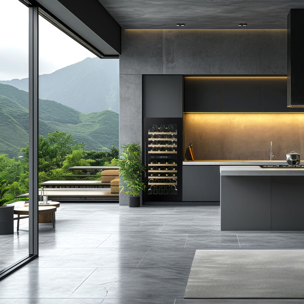 Встраиваемые холодильники для вина оснащаются специальной системой вентиляции: охлаждающая система у них находится в нижней части корпуса спереди. На такие устройства не навешивается мебельный фасад: дверца с затемненным стеклом остается на виду и открывается на достаточно широкий угол для свободного выдвижения деревянных полок.