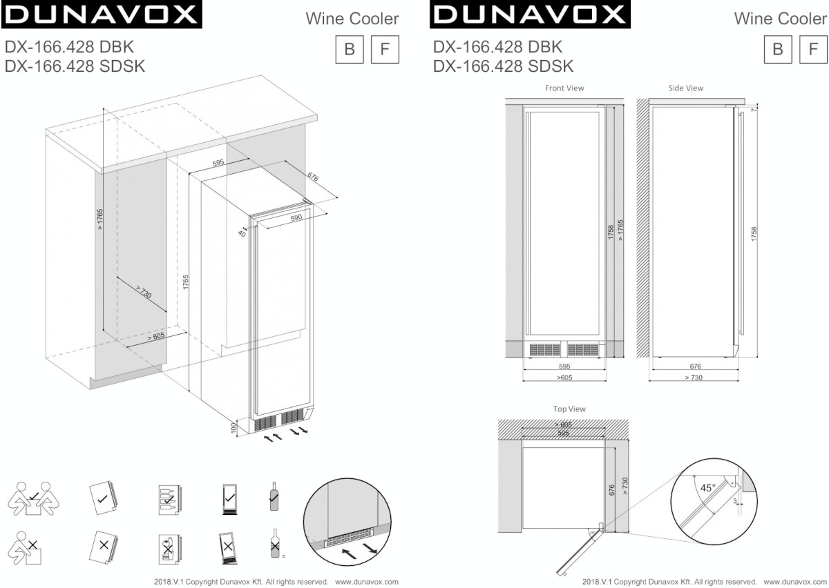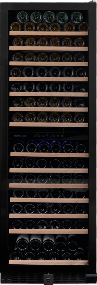 Винный холодильник Dunavox DX-166.428DMBK имеет две температурные зоны, в которых одновременно можно хранить разные сорта алкоголя и выставлять разные сочетания настроек. Он устанавливается отдельно, что удобно, если у вас есть специальное помещение — кладовая, погреб и т.д. Количество бутылок, которое можно разместить с учетом полной комплектации и из расчета объема бутылки 0,75 л, — 166 шт.