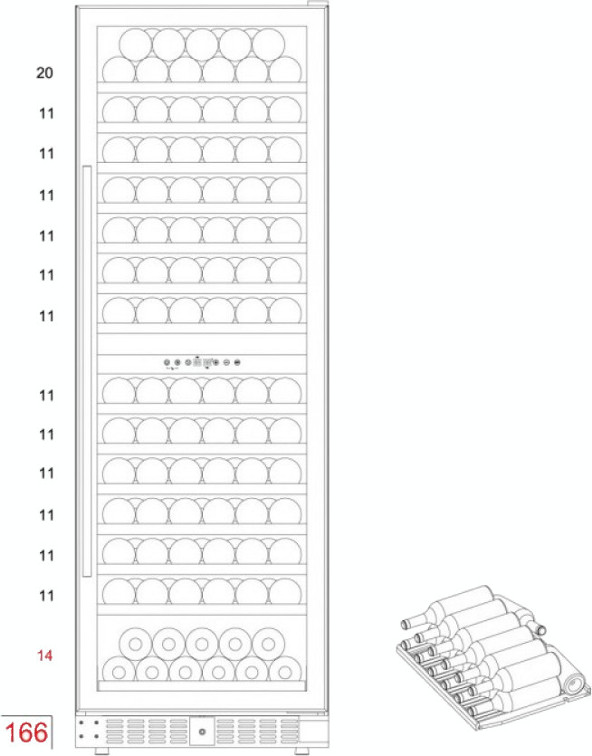 Стандартная вместительность рассчитывается по количеству бутылок «Бордо» 0,75 л. Это число также показывает максимальную загрузку при полной комплектации (полок, ящиков и других элементов).