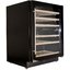 Встраиваемые холодильники для вина оснащаются специальной системой вентиляции: охлаждающая система у них находится в нижней части корпуса спереди. На такие устройства не навешивается мебельный фасад: дверца с затемненным стеклом остается на виду и открывается на достаточно широкий угол для свободного выдвижения деревянных полок.