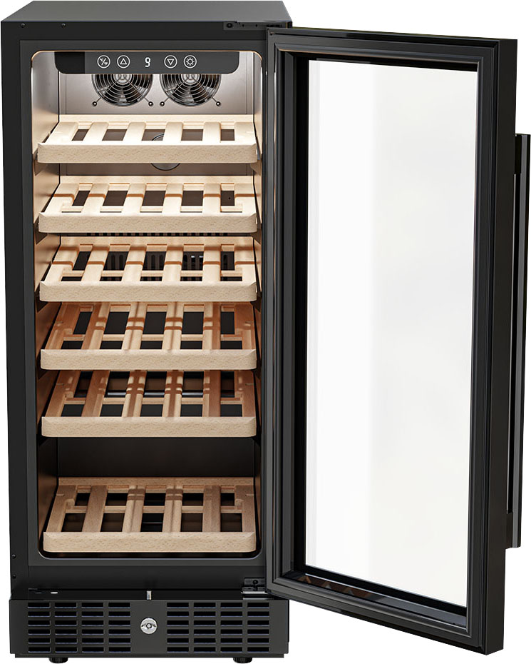 Стеклянная дверца винного шкафа — опция, которая решает сразу несколько задач. Прежде всего, она обеспечивает хороший обзор, позволяет контролировать коллекцию и демонстрировать ее, не открывая дверцу и не нарушая температурный режим. Стекло не только позволяет изолировать вино от наружного воздуха, но и не пропускает посторонние запахи. Прямые солнечные лучи также отрицательно влияют на качество вина, вызывая окисление танина — соединения, которое в нем содержится, и напиток становится горьким. Стеклянные дверцы снабжаются фильтрами или покрытием, защищающим бутылки по ультрафиолета. Способы защиты могут быть самыми разными — от наклеенной пленки до специального напыления. Иногда в дверцу устанавливается зеркальное стекло, в других случаях на него наносят тонировку в технике шелкографии.