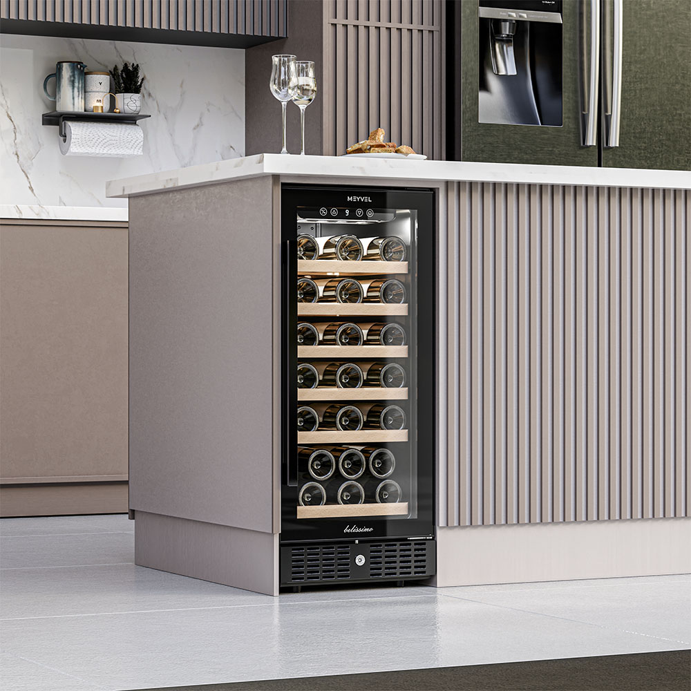 Винный холодильник Meyvel MV31BIG-KBT1 имеет одну температурную зону, в которой можно разместить бутылки и единовременно выставить только одну комбинацию настроек. Он устанавливается отдельно, что удобно, если у вас есть специальное помещение — кладовая, погреб и т.д. Благодаря компактным размерам данная модель — отличный выбор для офиса, гостиничного номера. Количество бутылок, которое можно разместить с учетом полной комплектации и из расчета объема бутылки 0,75 л, — 31 шт.