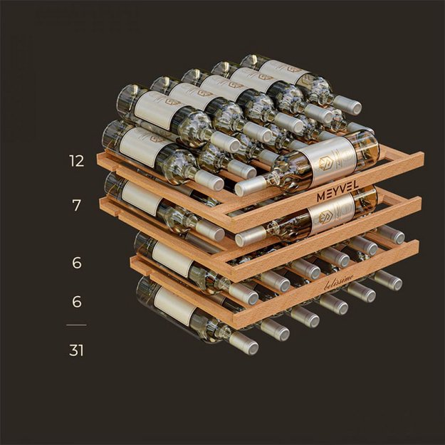 Винный холодильник Meyvel MV31PRO-KBB1 имеет одну температурную зону, в которой можно разместить бутылки и единовременно выставить только одну комбинацию настроек. Он встраивается в нишу, что удобно, если у вас ограничен метраж помещения. Благодаря компактным размерам данная модель — отличный выбор для офиса, гостиничного номера. Количество бутылок, которое можно разместить с учетом полной комплектации и из расчета объема бутылки 0,75 л, — 31 шт.