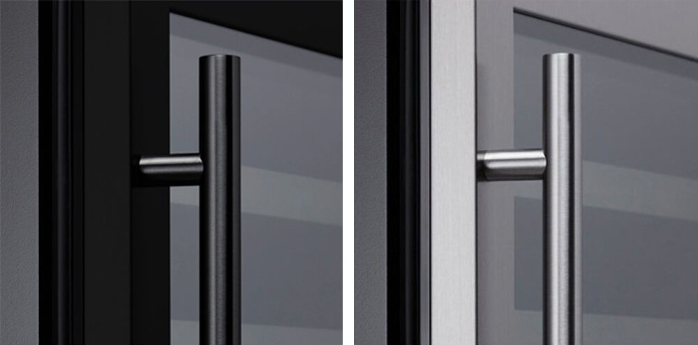 Вид и расположение ручки на дверце винного шкафа зависит прежде всего от дизайна и стиля изделия. В классических холодильниках со корпусом из дерева чаще всего используется внешняя ручка «под старину», изготовленная из металла — например, латуни, под бронзу или медь. Модели в современном стиле оснащаются внешними ручками из металла, выполненными в минималистическом стиле, или скрытыми ручками, создающими снаружи гладкую поверхность, за которой легко ухаживать. Некоторые производители предлагают винные шкафы без ручек: дверца у них открывается нажатием на среднюю или верхнюю часть.