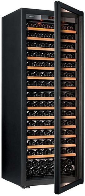 Стеклянная дверь — дополнительный изящный штрих к общему дизайну модели. Специальное покрытие защищает вино от влияния ультрафиолетовых лучей, которые проникают, если шкаф находится в солнечной комнате. Цвет корпуса — черный.