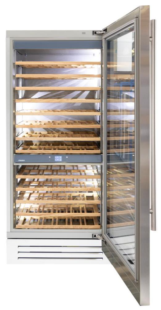 Винный холодильник Fhiaba KS900FW6 имеет две температурные зоны, в которых одновременно можно хранить разные сорта алкоголя и выставлять разные сочетания настроек. Он встраивается в нишу, что удобно, если у вас ограничен метраж помещения. Количество бутылок, которое можно разместить с учетом полной комплектации и из расчета объема бутылки 0,75 л, — 156 шт.
