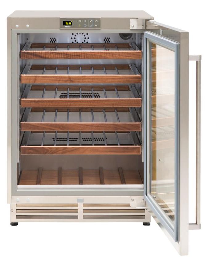 Ширина винного шкафа, как и другие их габариты, обязательно учитывается при выборе модели для домашнего или профессионального использования. Встраиваемые и отдельно стоящие модели выпускаются в самом широком ассортименте, так что разброс значений максимально велик. Неизменным спросом пользуются винные шкафы стандартной ширины — от 40 до 80 см, в современном и классическом стиле. Для встраиваемых шкафов наиболее удобной является ширина 60 см, позволяющая устанавливать их в кухонную тумбу или колонну. Вместимость их может быть самой различной и зависит в большей степени от высоты прибора. Маленькие винные шкафы с размещением на столешнице или даже с креплением к стене, рассчитанные на хранение от одной до десяти бутылок, могут иметь минимальную ширину от 13 см. На полках у них обычно помещается не более 5 бутылок, и используются они для охлаждения вина перед подачей. Большие винные шкафы с несколькими камерами и температурными зонами для длительного хранения и созревания разных сортов вина могут иметь ширину до 180 см, а максимальное значение этого параметра может составить 300 см. Как правило, это отдельно стоящие модели в деревянном корпусе с камерами side-by-side.