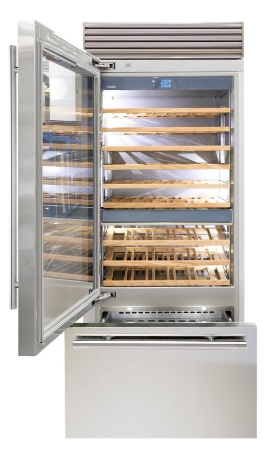 Винный холодильник Fhiaba XS901TWT3 имеет несколько температурных зон, в которых одновременно можно хранить разные сорта алкоголя и выставлять разные сочетания настроек. Он встраивается в нишу, что удобно, если у вас ограничен метраж помещения. Количество бутылок, которое можно разместить с учетом полной комплектации и из расчета объема бутылки 0,75 л, — 108 шт.