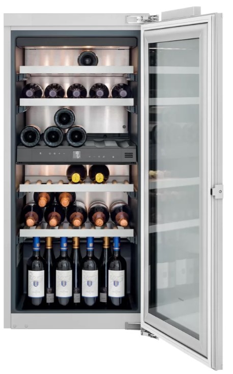 Встраиваемые холодильники для вина оснащаются специальной системой вентиляции: охлаждающая система у них находится в нижней части корпуса спереди. На такие устройства не навешивается мебельный фасад: дверца с затемненным стеклом остается на виду и открывается на достаточно широкий угол для свободного выдвижения деревянных полок.