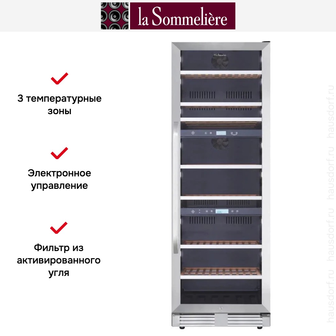 Винный холодильник La Sommeliere MT145TZ имеет несколько температурных зон, в которых одновременно можно хранить разные сорта алкоголя и выставлять разные сочетания настроек. Он устанавливается отдельно, что удобно, если у вас есть специальное помещение — кладовая, погреб и т.д. Количество бутылок, которое можно разместить с учетом полной комплектации и из расчета объема бутылки 0,75 л, — 143 шт.