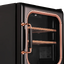 Стеклянная дверь — дополнительный изящный штрих к общему дизайну модели. Специальное покрытие защищает вино от влияния ультрафиолетовых лучей, которые проникают, если шкаф находится в солнечной комнате. Цвет корпуса — черный.