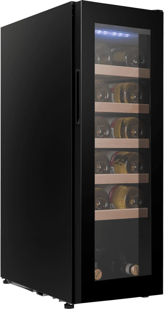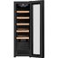 Холодильник для вина выглядит лаконично и солидно: корпус черного цвета, дверь со стеклопакетом в стальной рамке и скрытая ручка образуют строгую линию без лишних деталей. Узкий формат — всего 27 см по ширине при высоте 84 см и глубине 49 см — подчеркивает вертикаль, а тонированное стекло с защитой от УФ-излучения бережет напитки от света. Светодиодная подсветка мягко выделяет полки и этикетки, не перегружая интерьер. Дверной упор справа, при этом полотно можно перенавесить под конкретное расположение мебели.