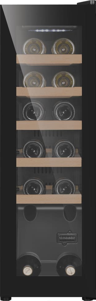 Это монотемпературный шкаф с одной камерой и одной зоной — стабильный микроклимат задается в диапазоне 5-20 °C, а влажность поддерживается на уровне 50-80%. Компрессорное охлаждение в связке с вентиляцией равномерно распределяет холод, что важно при долгом хранении. Внутри — 5 выдвижных полок из массива бука: древесина держит бутылки в горизонтальном положении мягко и устойчиво, облегчая доступ. Полезный объем 45 л рассчитан на 12 стандартных бутылок 0,75 л — компактная коллекция легко организуется по стилю и году урожая.
