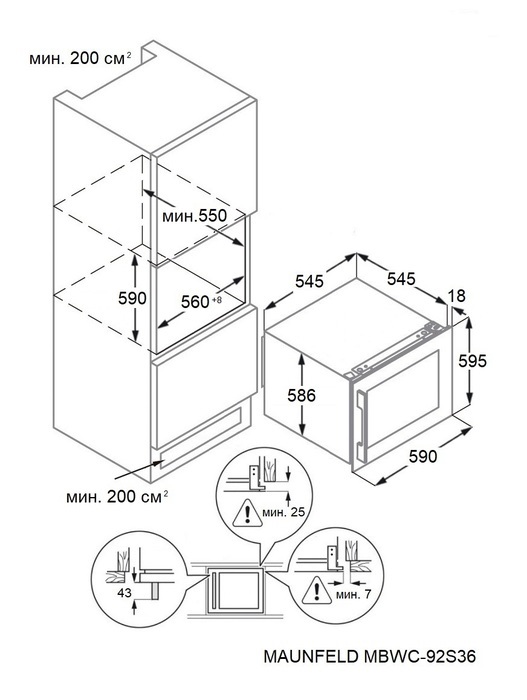 Некоторые отдельно стоящие винные шкафы, а также модели, встраиваемые в мебельную колонну, шкаф или другое закрытое пространство, оснащаются системой забора воздуха и вентиляционной решеткой, расположенными спереди в нижней части корпуса. Зазоры между корпусом шкафа и стенками мебели необходимы и в этом случае.