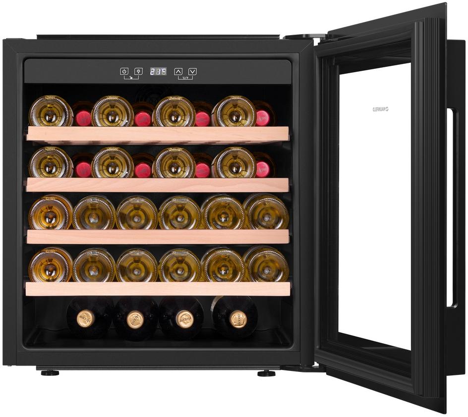 Стеклянная дверь — дополнительный изящный штрих к общему дизайну модели. Специальное покрытие защищает вино от влияния ультрафиолетовых лучей, которые проникают, если шкаф находится в солнечной комнате. Цвет корпуса — черный. Дверь можно перевесить на другую сторону, поэтому вариантов размещения его в доме становится больше.