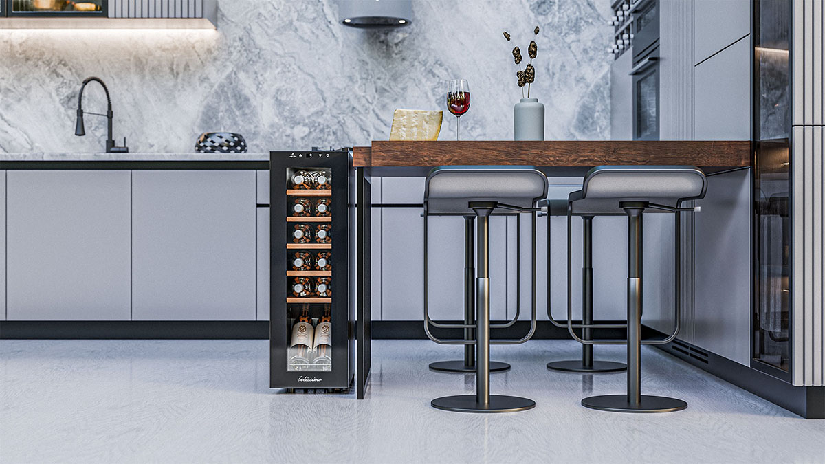 Частичное встраивание отдельно стоящих винных шкафов в нишу — полезная опция, позволяющая сэкономить место в помещении и выбрать лучшее расположение прибора. Устанавливать в нишу или под столешницу рекомендуется только компрессорные модели — другие, например, термоэлектрические, не смогут достаточно вентилироваться при таком расположении. Если винный холодильник оснащен воздухозаборными решетками и радиатором охлаждения в нижней части, он может быть встроен без зазоров. Для удаления нагретого воздуха требуется свободный проход по всей длине холодильника от цоколя до верхней части.