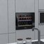 Встраиваемые холодильники для вина оснащаются специальной системой вентиляции: охлаждающая система у них находится в нижней части корпуса спереди. На такие устройства не навешивается мебельный фасад: дверца с затемненным стеклом остается на виду и открывается на достаточно широкий угол для свободного выдвижения деревянных полок.