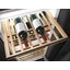 Самым подходящим материалом для изготовления полок, по мнению специалистов, является натуральное не лакированное дерево — бук, дуб, сосна, лиственница. У него множество преимуществ: прежде всего оно способно гасить мелкие вибрации. Дерево хорошо поддается обработке: решетчатые полки, например, позволяют хорошо зафиксировать бутылки, так что они не будут качаться при выдвижении. Кроме того, дерево почти не впитывает запахи и при понижении температуры на нем не образуется конденсат. В некоторых моделях применяются комбинированные полки с металлическим каркасом и деревянными держателями бутылок, а также полностью металлические. Недостаток их — образование конденсата, а значит, изменение уровня влажности, которое может привести также к порче этикеток. Самый бюджетный и наименее эффектный вариант — полки из пластика, имеющие те же недостатки, что и металлические.