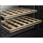Встраиваемые холодильники для вина оснащаются специальной системой вентиляции: охлаждающая система у них находится в нижней части корпуса спереди. На такие устройства не навешивается мебельный фасад: дверца с затемненным стеклом остается на виду и открывается на достаточно широкий угол для свободного выдвижения деревянных полок.