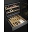 Встраиваемые холодильники для вина оснащаются специальной системой вентиляции: охлаждающая система у них находится в нижней части корпуса спереди. На такие устройства не навешивается мебельный фасад: дверца с затемненным стеклом остается на виду и открывается на достаточно широкий угол для свободного выдвижения деревянных полок.