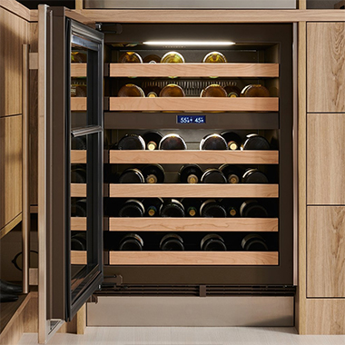 Встраиваемые холодильники для вина оснащаются специальной системой вентиляции: охлаждающая система у них находится в нижней части корпуса спереди. На такие устройства не навешивается мебельный фасад: дверца с затемненным стеклом остается на виду и открывается на достаточно широкий угол для свободного выдвижения деревянных полок.