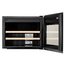 Стеклянная дверь — дополнительный изящный штрих к общему дизайну модели. Специальное покрытие защищает вино от влияния ультрафиолетовых лучей, которые проникают, если шкаф находится в солнечной комнате. Хранение становится еще безопаснее и герметичнее благодаря нескольким слоям стекол. Цвет корпуса — черный.