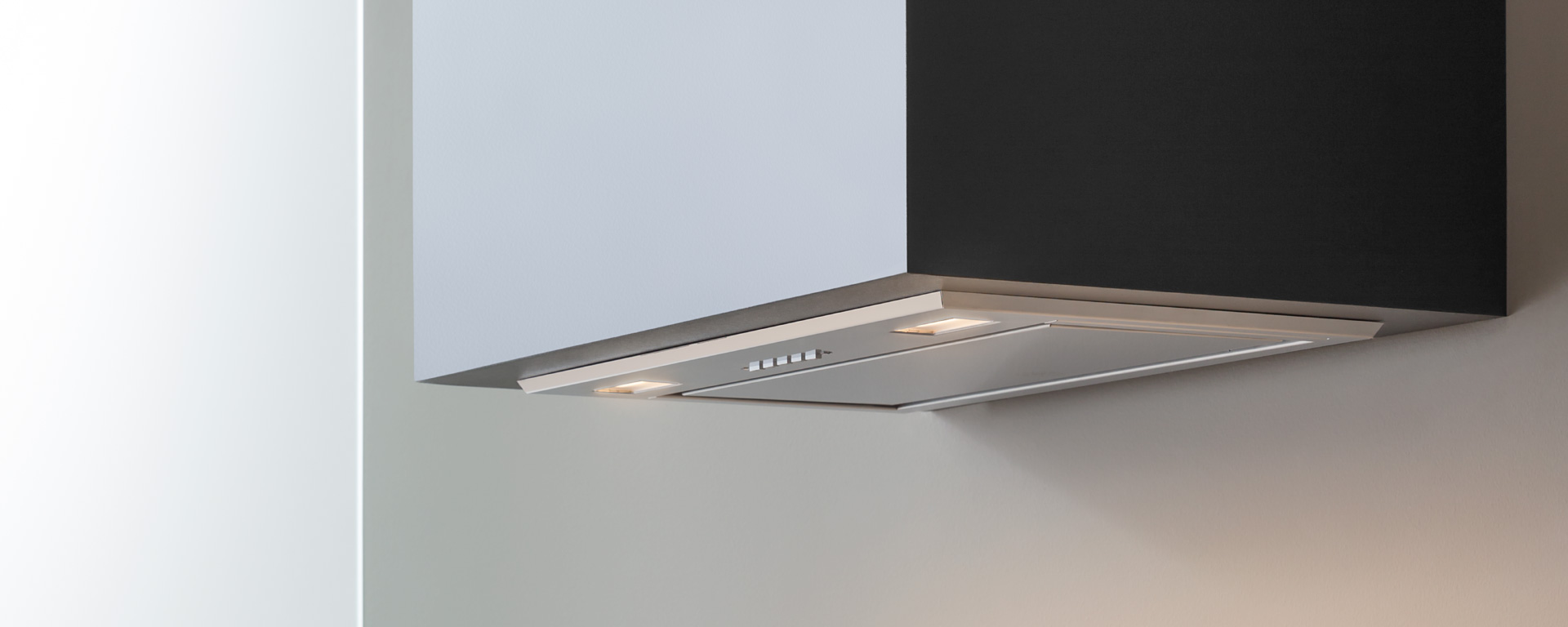 Встраивание вытяжки в шкаф — оптимальный вариант для малогабаритной кухни. Такие модели просты в установке, недороги, практически скрыты от глаз, их не нужно подбирать по внешнему виду, а также чем-то маскировать воздуховод. Уровень шума также снижается благодаря дополнительной звукоизоляции. Встроенные в шкаф модели могут дополняться выдвижной панелью, которая увеличивает площадь забора загрязненного воздуха. Иногда к встраиваемым относят также вытяжки, которые монтируются под подвесной шкаф, хотя их корпус остается на виду.