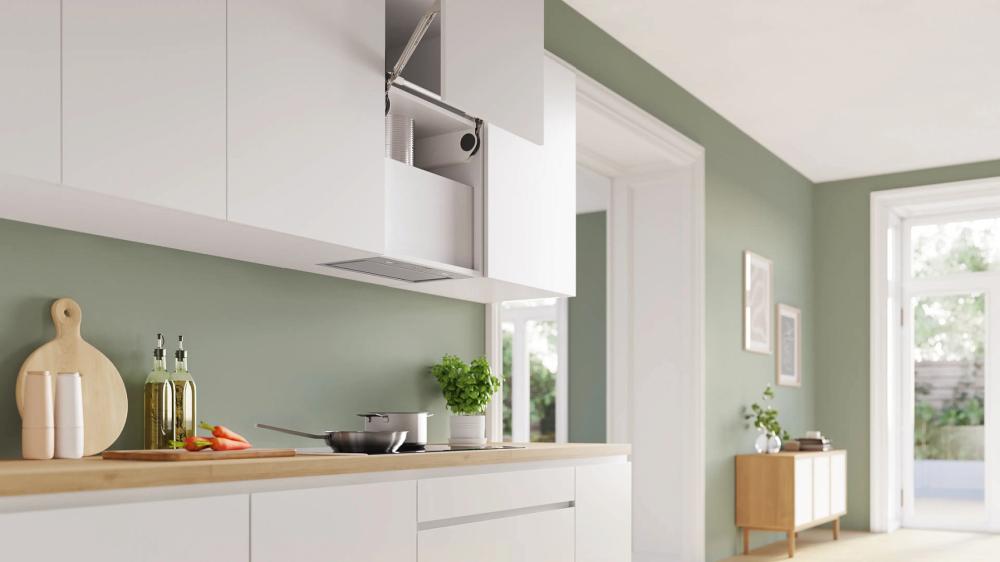 Вытяжки, встраиваемые в столешницу — эффективная инновация, которая подойдет для установки в кухне любой площади. Такие вытяжки размещаются за варочной поверхностью или рядом с ней. В отключенном состоянии всасывающая панель находится под столешницей, но после включения одной или нескольких конфорок она автоматически выдвигается при помощи специального лифтового механизма. Загрязненный воздух улавливается, не успевая распространиться по помещению. Когда вытяжка убрана, на виду остается только сенсорная панель управления. Недостатком подобных моделей является только сравнительно высокая цена.