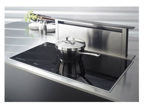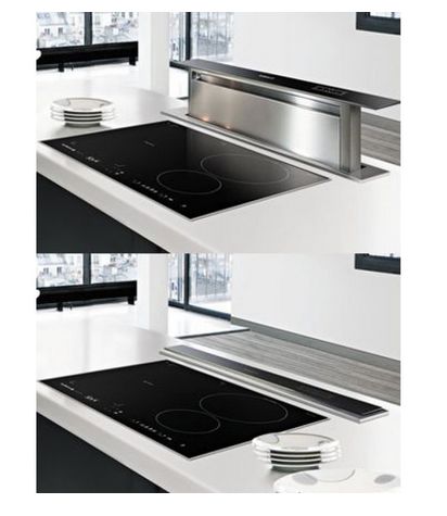 Вытяжки, встраиваемые в столешницу — эффективная инновация, которая подойдет для установки в кухне любой площади. Такие вытяжки размещаются за варочной поверхностью или рядом с ней. В отключенном состоянии всасывающая панель находится под столешницей, но после включения одной или нескольких конфорок она автоматически выдвигается при помощи специального лифтового механизма. Загрязненный воздух улавливается, не успевая распространиться по помещению. Когда вытяжка убрана, на виду остается только сенсорная панель управления. Недостатком подобных моделей является только сравнительно высокая цена.