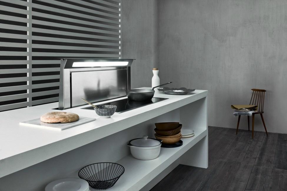 Вытяжки, встраиваемые в столешницу — эффективная инновация, которая подойдет для установки в кухне любой площади. Такие вытяжки размещаются за варочной поверхностью или рядом с ней. В отключенном состоянии всасывающая панель находится под столешницей, но после включения одной или нескольких конфорок она автоматически выдвигается при помощи специального лифтового механизма. Загрязненный воздух улавливается, не успевая распространиться по помещению. Когда вытяжка убрана, на виду остается только сенсорная панель управления. Недостатком подобных моделей является только сравнительно высокая цена.