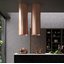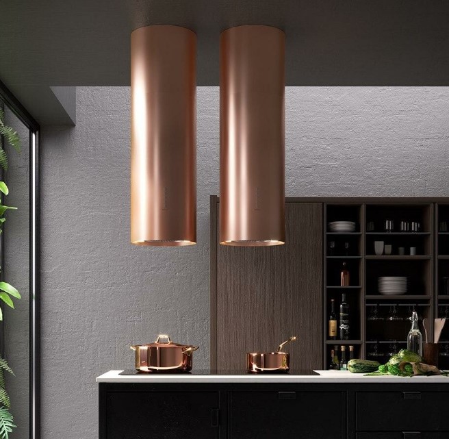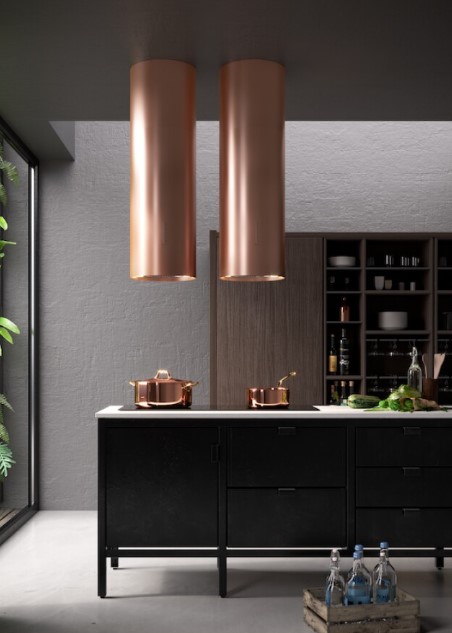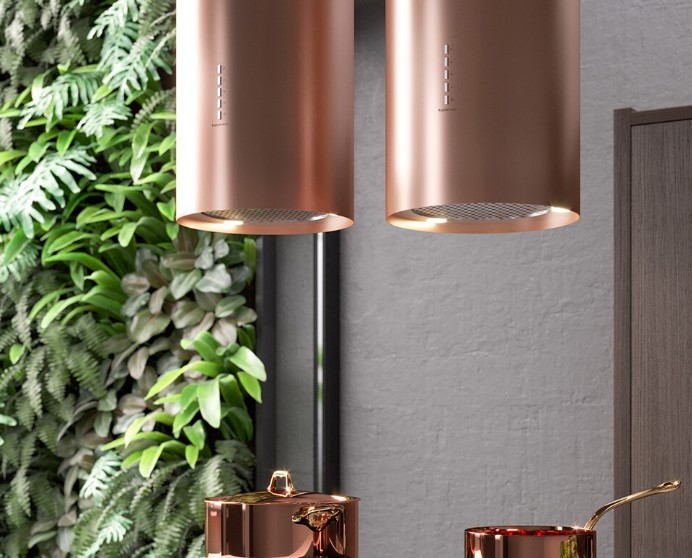 Данная вытяжка крепится к потолку — обычно над кухонным островом, где расположена рабочая зона. Обратите внимание на цветовые сочетания модели Falmec POLAR EVO ISOLA RAME 35, чтобы органично вписать ее в свою квартиру. Оттенок корпуса: медь. Благодаря лампочкам, которые расположены на нем, можно освещать плиту и столешницу рядом, чтобы готовить было еще проще и приятнее.